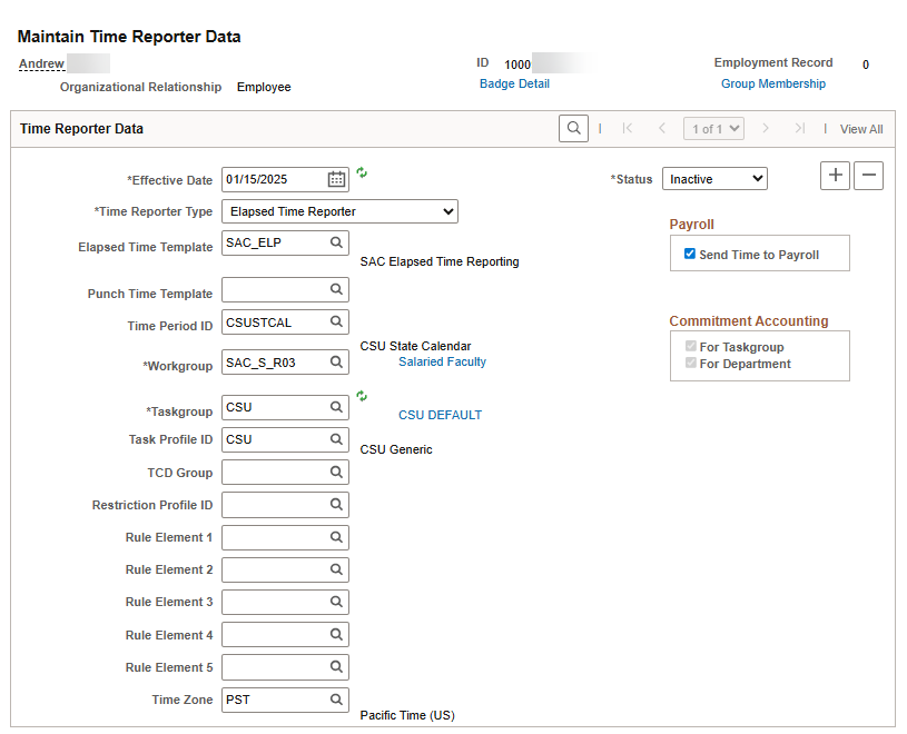 Navigation: Time and Labor -> Enroll Time Reporters -> Maintain Time Reporter Data