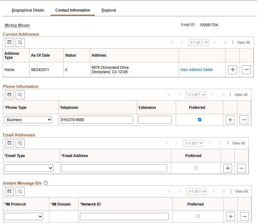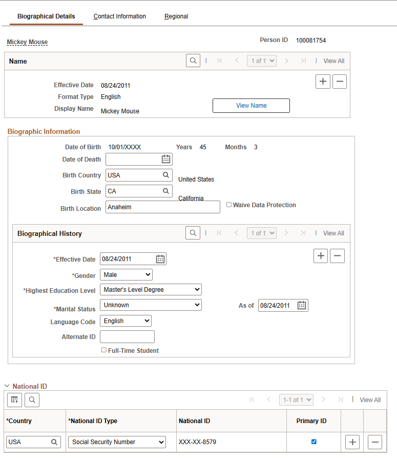 Navigation: Workforce Administration > Personal Information > Biographical > Add a Person or Modify a Person |